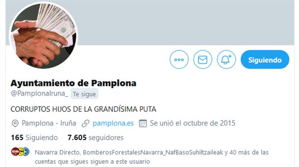 La primera cuenta hackeada fue la del Ayuntamiento de Pamplona, que empezó a publicar insultos y amenazas de muerte contra el alcalde de la ciudad, Enrique Maya, de Navarra Suma, principios de agosto.