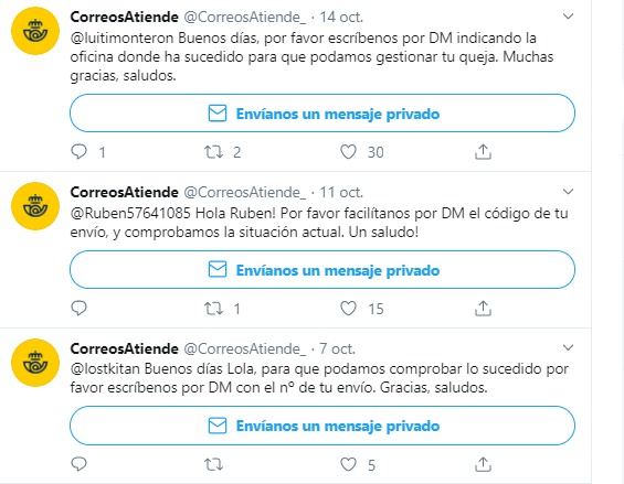 - En el caso de cuentas de Atención al Cliente como la de Correos, en que se puede ver que se prestaba dicho servicio a través de la cuenta de Twitter en mensajes privados, el acceso no autorizado permitirá al atacante acceder a las conversaciones que se pudieran haber mantenido y aún se conservaran en la cuenta.