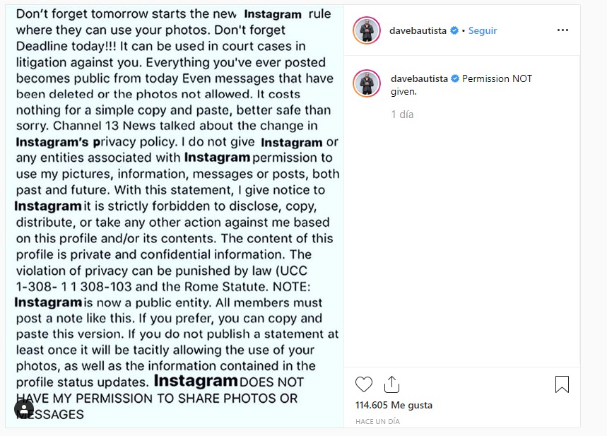 Aunque los responsables de comunicación de Instagram ya han confirmado de nuevo que lo indicado en el texto no es cierto, mucha gente aún tiene este texto en sus perfiles, como es el caso de Dave Bautista