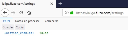 Si recordamos la nota de prensa de la Liga de Fútbol Profesional, se nos indicaba que las grabaciones se limitarían a determinados momentos, es decir, no se trataría de un uso continuado del dispositivo de grabación o de los datos de geolocalización del terminalLaLiga sólo activará el micrófono y geoposicionamiento del dispositivo móvil durante las franjas horarias de partidos en los que compitan equipos de LaLiga.La pregunta es cómo discrimina la aplicación que nos encontramos ante una de estas franjas horarias. Podemos observar como en diversas instancias se hace referencia a getMatchLive [java] if (DataManager.INSTANCE.getMatchLive()) { DataManager.INSTANCE.sendUserLocation(this.fluzoId, this.longitude, this.latitude, TimeUnit.MILLISECONDS.toSeconds(System.currentTimeMillis())); } [/java] Esta función, localizada en DataManager, devuelve un valor booleano que permitirá a la aplicación saber si se encuentra en una franja horaria de partidos o no [java] public boolean getMatchLive() { boolean z = false; try { String source = getBufferReaderJson("https://laliga.fluzo.com/settings"); if (source != null) { z = ((Settings) getCustomGsonInstance().fromJson(source, Settings.class)).isLocation_enabled(); } } catch (Exception e) { e.printStackTrace(); } return z; } [/java] En este caso, la información se proporciona desde los propios servidores de fluzo, con un subdominio dedicado para el servicio que prestan a la LFP, ejecutando un GET en el endpoint 'settings'. Basta usar un navegador para ver qué tipo de información es la que se nos devuelve
