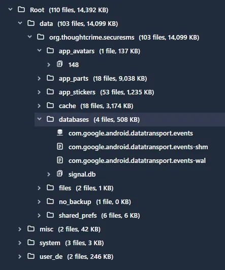 No se trata por tanto de una interceptación de los mensajes antes de su entrega, o de colaboración de Signal para llevar a cabo dicha tarea, sino que se trata de un supuesto concreto en que se realiza el análisis de los mensajes tras poder revisar la estructura de almacenamiento de la app tras poder tener acceso a ella. Esto supone que todo lo que se verá a continuación no resultaría posible si, por la protección del sistema, no se pudiera acceder a los ficheros y carpetas necesarios.
