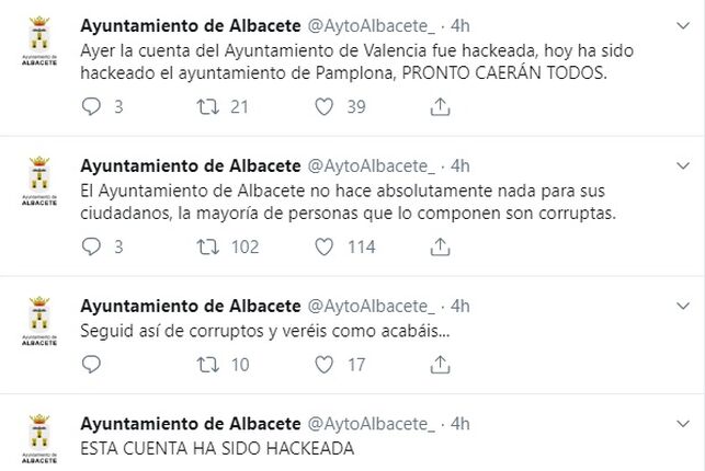 Aún podemos encontrar capturas de los tuits emitidos desde la cuenta del Ayuntamiento de Albacete mientras permaneció bajo control del delincuente, y podemos encontrar elementos comunes con el resto de ayuntamientos afectados