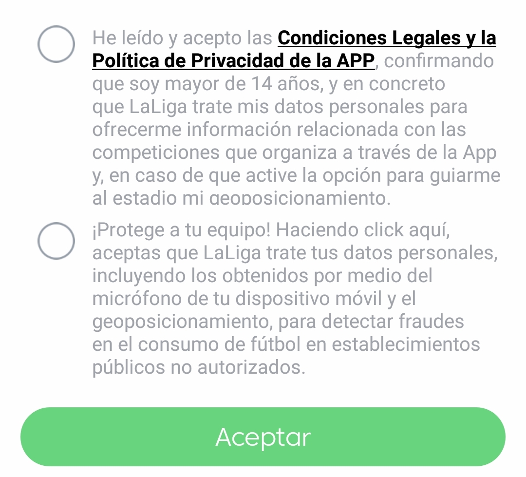 Uso del micrófono: Sólo en el caso de que aceptes la casilla habilitada al efecto, así como mediante la ventana emergente que aparece en la APP, LaLiga podrá activar el micrófono de tu dispositivo para conocer si estás viendo partidos de fútbol de equipos de LaLiga. Esta información se utilizará para detectar fraudes.