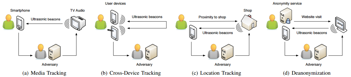 The beacons are frequencies from 18kHz to 20kHz, a range that is inaudible to most humans but can be reliably detected by most phone microphones. By embedding them into audio, marketers can track the whereabouts of shoppers as they move throughout a large department store. Promoters using other companies' audio-beacon technologies can also use them to push ads or coupons to people who are near a certain store or service. The researchers said two services—Shopkick and Lisnr—use ultrasonic beaconing for legitimate purposes such as these, and they disclose the tracking prominently.