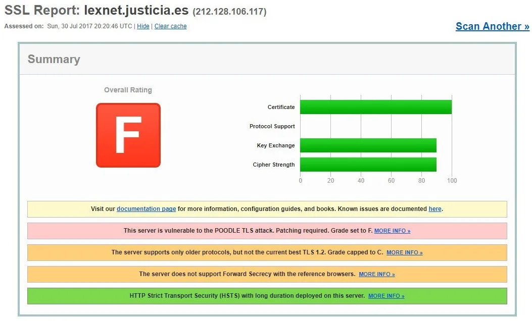 Como ya mencioné en mi post anterior, solo podemos analizar este servicio a base de prueba y error, y únicamente he realizado comprobaciones en superficie dada la naturaleza del servicio prestado y la titularidad del mismo. Una de las primeras capas que hemos de tener en cuenta es la comunicación con el servidor, la seguridad del canal a través del cual los usuarios del servicio realizarán sus trámites. El viernes se realizó un escaneo del servicio, obteniendo la puntuación más baja al utilizar protocolos desfasados, y no contar con protección contra determinados ataques.