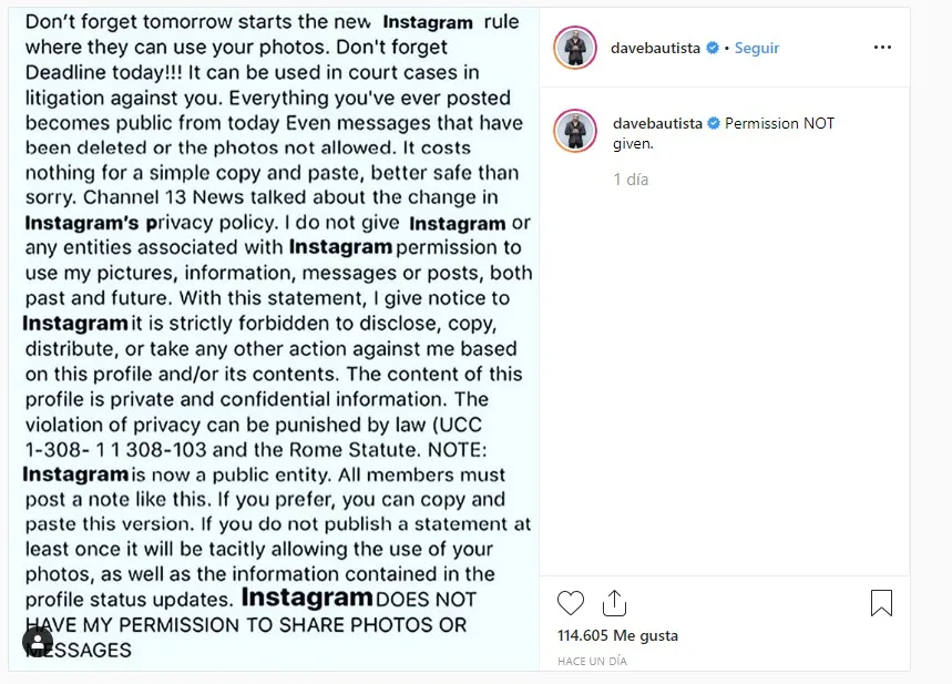 Aunque los responsables de comunicación de Instagram ya han confirmado de nuevo que lo indicado en el texto no es cierto, mucha gente aún tiene este texto en sus perfiles, como es el caso de Dave Bautista